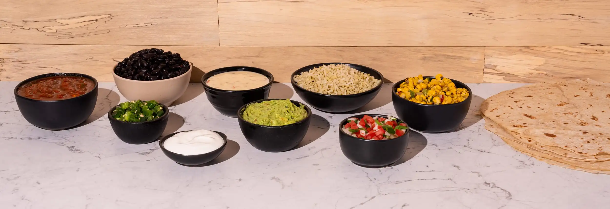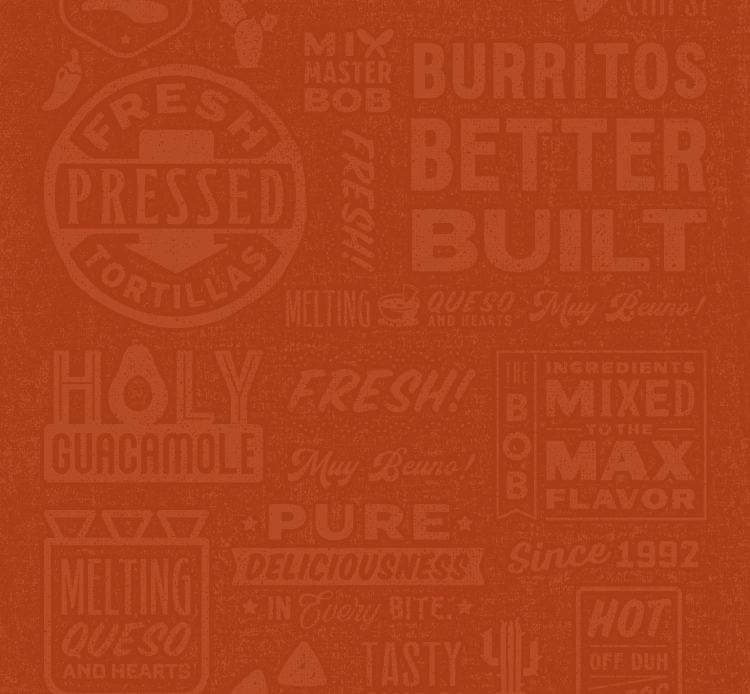 Fresh-pressed tortillas • Black or Pinto Beans • Sautéed veggies • Cheese • Lettuce • Jalapeños • Queso • Guacamole • Signature Salsas